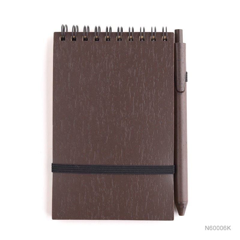 Spiral notebook with bamboo cover. Bamboo barrel ball pen with bamboo fiber trims. With black elastic band and pen holder. ECO kraft inner page with recycled symbol printing.