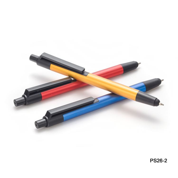 2 in 1 ball pen, pushing action ballpen with Aluminium barrel, with solid black button and clip. black screen touch stylus on the tip