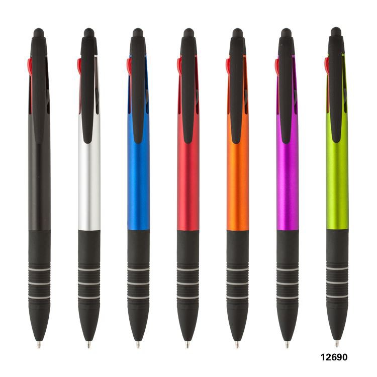 3 Colors multicolor ballpen with sprayed colored barrel and black grip, plastic clip, tip and stylus on top, ink color is black, blue and red.