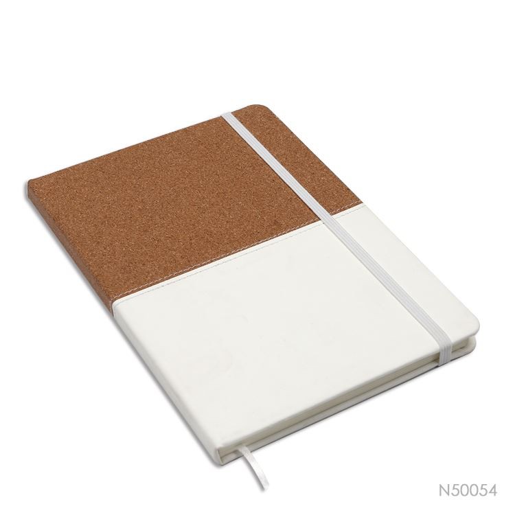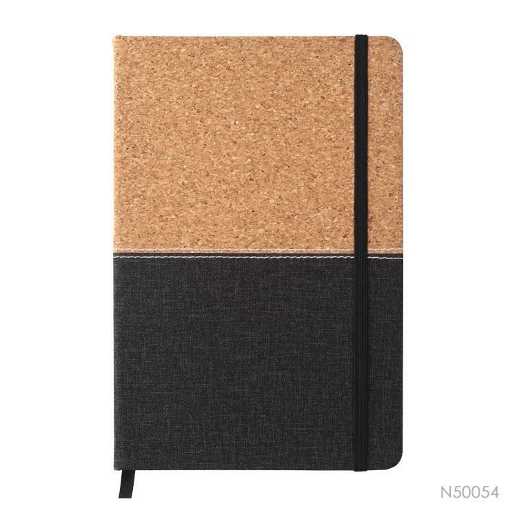 A5 Notebook with cork and linen splicing cover. 80sheets 70 gsm lined inner pages, with elastic band and ribbon bookmark.