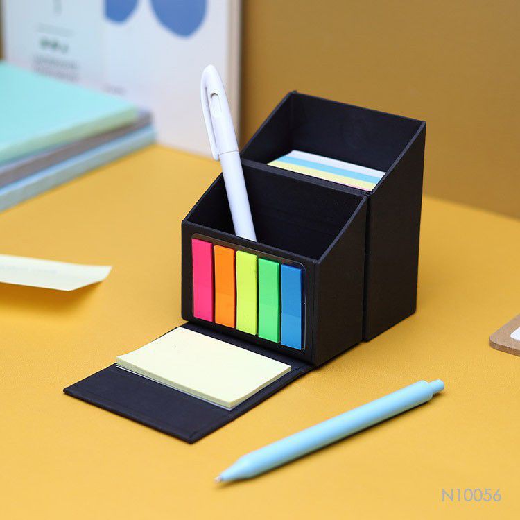 Black brick type note box with pen holder.5 different color of 25 sheets PET sticky note and 25 sheets yellow big stickers,4 colors notes in the box with 100 sheets.