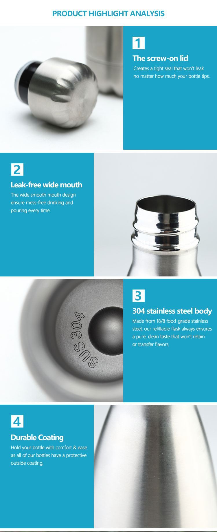 2. The eco-friendly water bottle with 100% leak proof twist lid is completely BPA free. Healthy drink is ensured, portable for carry around.