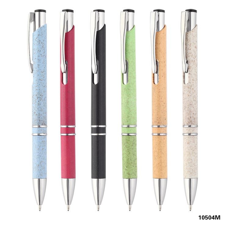 This Wheat Straw Ballpoint Pen’s barrel is made with 45% wheat straw and ABS plastic with chrome accents. Click action mechanism. Wheat straw is left over stalk after wheat grains are harvested, making it a sustainable material. The wheat straw in this pen reduces the amount of plastic used.
